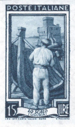 Italia al lavoro. S. rotocalco - F.     I e      III - D. 14  b. - Fg. 50 - V. 31.03.1958 Filigrana       I DB DA SA SB Vignetta Liguria, maestro d' ascia a Rapallo. Colore    Grigio azzurro. Filigrana       III